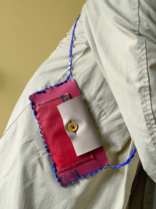 Weaved in fabric and cotton strap. Finished in hand embroidery